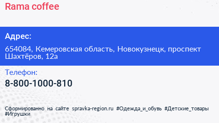 Rama coffee по адресу 654084, Кемеровская область, Новокузнецк, проспект Шахтёров, 12а в дальнейшем Организация, размещена в следующих категориях: