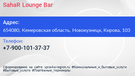 SahaR Lounge Bar по адресу 654080, Кемеровская область, Новокузнецк, Кирова, 103 в дальнейшем Организация, размещена в следующих категориях: