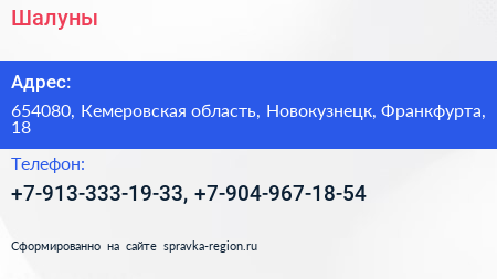 Шалуны по адресу 654080, Кемеровская область, Новокузнецк, Франкфурта, 18 в дальнейшем Организация, размещена в следующих категориях: