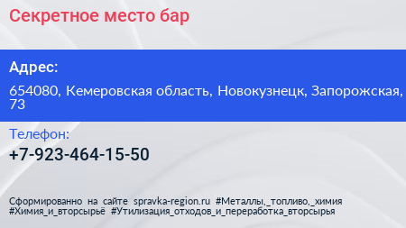Секретное место, бар по адресу 654080, Кемеровская область, Новокузнецк, Запорожская, 73 в дальнейшем Организация, размещена в следующих категориях: