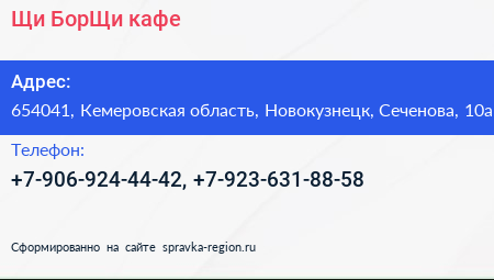 Щи-БорЩи, кафе по адресу 654041, Кемеровская область, Новокузнецк, Сеченова, 10а в дальнейшем Организация, размещена в следующих категориях: