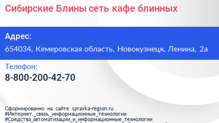 Сибирские Блины, сеть кафе-блинных по адресу 654034, Кемеровская область, Новокузнецк, Ленина, 2а в дальнейшем Организация, размещена в следующих категориях: