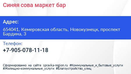 Синяя сова, маркет-бар по адресу 654041, Кемеровская область, Новокузнецк, проспект Бардина, 3 в дальнейшем Организация, размещена в следующих категориях: