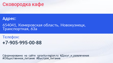 Сковородка, кафе по адресу 654041, Кемеровская область, Новокузнецк, Транспортная, 63а в дальнейшем Организация, размещена в следующих категориях: