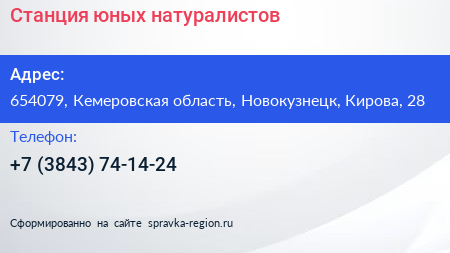 Станция юных натуралистов по адресу 654079, Кемеровская область, Новокузнецк, Кирова, 28 в дальнейшем Организация, размещена в следующих категориях: