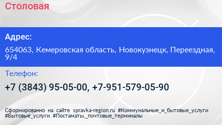 Столовая по адресу 654063, Кемеровская область, Новокузнецк, Переездная, 9/4 в дальнейшем Организация, размещена в следующих категориях: