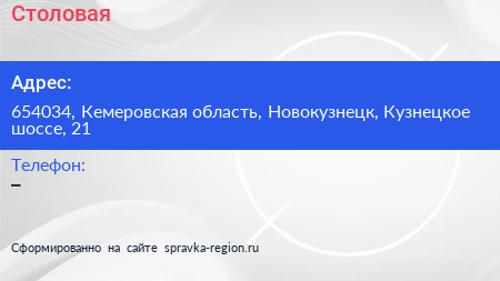 Столовая по адресу 654034, Кемеровская область, Новокузнецк, Кузнецкое шоссе, 21 в дальнейшем Организация, размещена в следующих категориях:
