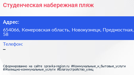 Студенческая набережная, пляж по адресу 654066, Кемеровская область, Новокузнецк, Предмостная, 58 в дальнейшем Организация, размещена в следующих категориях: