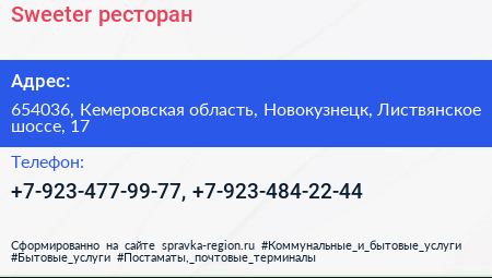 Sweeter, ресторан по адресу 654036, Кемеровская область, Новокузнецк, Листвянское шоссе, 17 в дальнейшем Организация, размещена в следующих категориях: