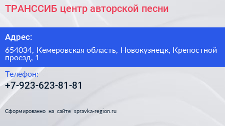 ТРАНССИБ, центр авторской песни по адресу 654034, Кемеровская область, Новокузнецк, Крепостной проезд, 1 в дальнейшем Организация, размещена в следующих категориях: