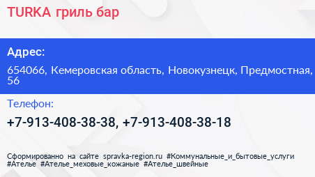 TURKA, гриль-бар по адресу 654066, Кемеровская область, Новокузнецк, Предмостная, 56 в дальнейшем Организация, размещена в следующих категориях: