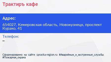 Трактиръ, кафе по адресу 654027, Кемеровская область, Новокузнецк, проспект Курако, 41 в дальнейшем Организация, размещена в следующих категориях: