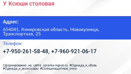 У Ксюши, столовая по адресу 654041, Кемеровская область, Новокузнецк, Транспортная, 25 в дальнейшем Организация, размещена в следующих категориях: