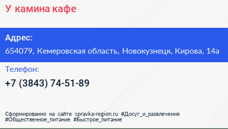 У камина, кафе по адресу 654079, Кемеровская область, Новокузнецк, Кирова, 14а в дальнейшем Организация, размещена в следующих категориях: