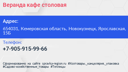 Веранда, кафе-столовая по адресу 654031, Кемеровская область, Новокузнецк, Ярославская, 15Б в дальнейшем Организация, размещена в следующих категориях: