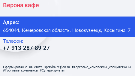Верона, кафе по адресу 654044, Кемеровская область, Новокузнецк, Косыгина, 7 в дальнейшем Организация, размещена в следующих категориях: