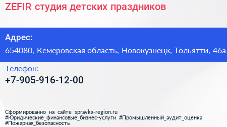 ZEFIR, студия детских праздников по адресу 654080, Кемеровская область, Новокузнецк, Тольятти, 46а в дальнейшем Организация, размещена в следующих категориях: