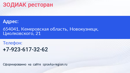 ЗОДИАК, ресторан по адресу 654041, Кемеровская область, Новокузнецк, Циолковского, 21 в дальнейшем Организация, размещена в следующих категориях: