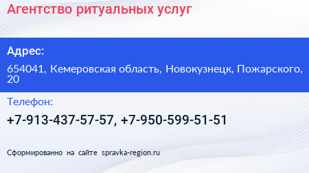 Агентство ритуальных услуг по адресу 654041, Кемеровская область, Новокузнецк, Пожарского, 20 в дальнейшем Организация, размещена в следующих категориях: