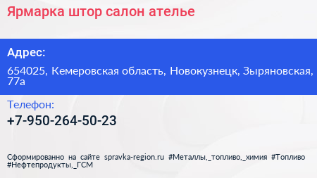 Ярмарка штор, салон-ателье по адресу 654025, Кемеровская область, Новокузнецк, Зыряновская, 77а в дальнейшем Организация, размещена в следующих категориях: