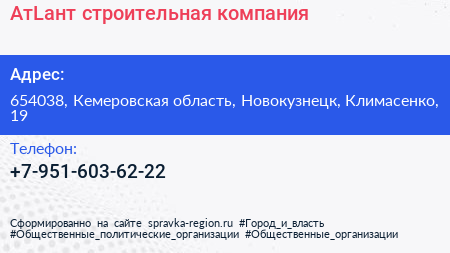 АтLант, строительная компания по адресу 654038, Кемеровская область, Новокузнецк, Климасенко, 19 в дальнейшем Организация, размещена в следующих категориях: