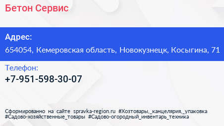 Бетон Сервис по адресу 654054, Кемеровская область, Новокузнецк, Косыгина, 71 в дальнейшем Организация, размещена в следующих категориях: