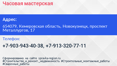 Часовая мастерская по адресу 654079, Кемеровская область, Новокузнецк, проспект Металлургов, 17 в дальнейшем Организация, размещена в следующих категориях: