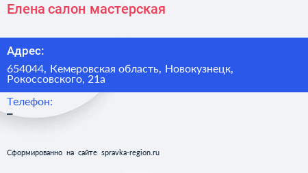 Елена, салон-мастерская по адресу 654044, Кемеровская область, Новокузнецк, Рокоссовского, 21а в дальнейшем Организация, размещена в следующих категориях: