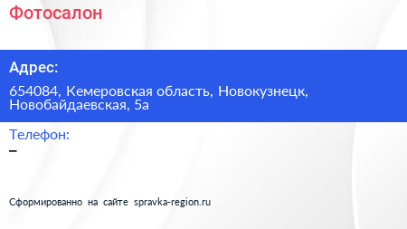 Фотосалон по адресу 654084, Кемеровская область, Новокузнецк, Новобайдаевская, 5а в дальнейшем Организация, размещена в следующих категориях:
