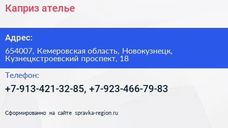 Каприз, ателье по адресу 654007, Кемеровская область, Новокузнецк, Кузнецкстроевский проспект, 18 в дальнейшем Организация, размещена в следующих категориях: