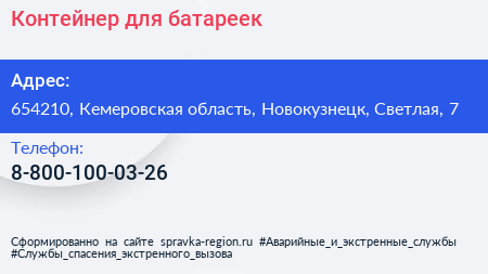 Контейнер для батареек по адресу 654210, Кемеровская область, Новокузнецк, Светлая, 7 в дальнейшем Организация, размещена в следующих категориях: