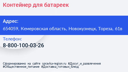Контейнер для батареек по адресу 654059, Кемеровская область, Новокузнецк, Тореза, 61в в дальнейшем Организация, размещена в следующих категориях: