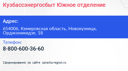 Кузбассэнергосбыт, Южное отделение по адресу 654006, Кемеровская область, Новокузнецк, Орджоникидзе, 18 в дальнейшем Организация, размещена в следующих категориях: