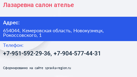 Лазаревна, салон-ателье по адресу 654044, Кемеровская область, Новокузнецк, Рокоссовского, 1 в дальнейшем Организация, размещена в следующих категориях: