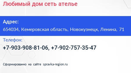 Любимый дом, сеть ателье по адресу 654034, Кемеровская область, Новокузнецк, Ленина, 71 в дальнейшем Организация, размещена в следующих категориях: