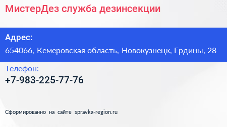 МистерДез, служба дезинсекции по адресу 654066, Кемеровская область, Новокузнецк, Грдины, 28 в дальнейшем Организация, размещена в следующих категориях: