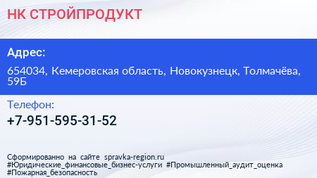 НК-СТРОЙПРОДУКТ по адресу 654034, Кемеровская область, Новокузнецк, Толмачёва, 59Б в дальнейшем Организация, размещена в следующих категориях: