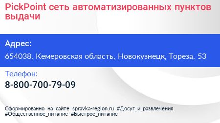 PickPoint, сеть автоматизированных пунктов выдачи по адресу 654038, Кемеровская область, Новокузнецк, Тореза, 53 в дальнейшем Организация, размещена в следующих категориях: