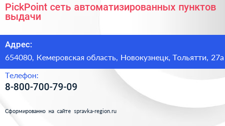 PickPoint, сеть автоматизированных пунктов выдачи по адресу 654080, Кемеровская область, Новокузнецк, Тольятти, 27а в дальнейшем Организация, размещена в следующих категориях: