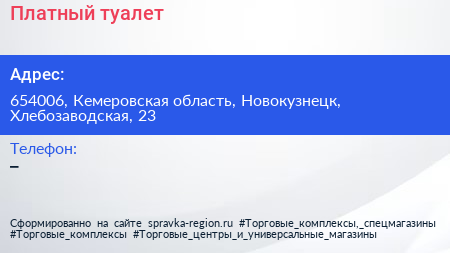 Платный туалет по адресу 654006, Кемеровская область, Новокузнецк, Хлебозаводская, 23 в дальнейшем Организация, размещена в следующих категориях: