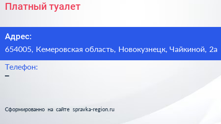 Платный туалет по адресу 654005, Кемеровская область, Новокузнецк, Чайкиной, 2а в дальнейшем Организация, размещена в следующих категориях: