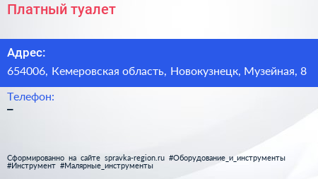 Платный туалет по адресу 654006, Кемеровская область, Новокузнецк, Музейная, 8 в дальнейшем Организация, размещена в следующих категориях: