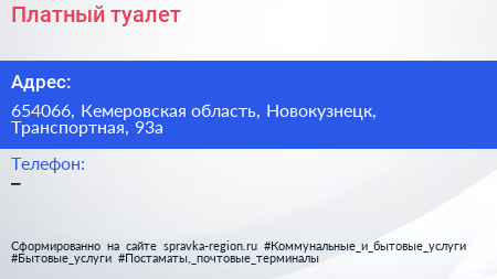 Платный туалет по адресу 654066, Кемеровская область, Новокузнецк, Транспортная, 93а в дальнейшем Организация, размещена в следующих категориях: