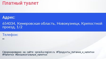 Платный туалет по адресу 654034, Кемеровская область, Новокузнецк, Крепостной проезд, 1/2 в дальнейшем Организация, размещена в следующих категориях: