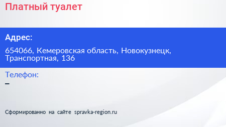 Платный туалет по адресу 654066, Кемеровская область, Новокузнецк, Транспортная, 136 в дальнейшем Организация, размещена в следующих категориях: