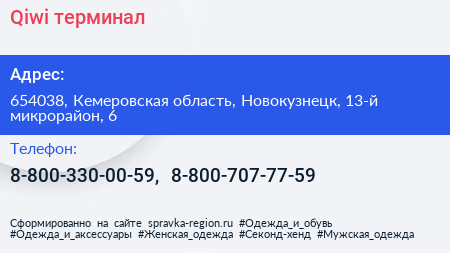 Qiwi, терминал по адресу 654038, Кемеровская область, Новокузнецк, 13-й микрорайон, 6 в дальнейшем Организация, размещена в следующих категориях: