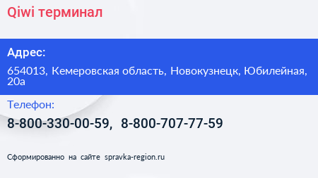 Qiwi, терминал по адресу 654013, Кемеровская область, Новокузнецк, Юбилейная, 20а в дальнейшем Организация, размещена в следующих категориях: