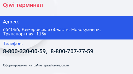 Qiwi, терминал по адресу 654066, Кемеровская область, Новокузнецк, Транспортная, 115а в дальнейшем Организация, размещена в следующих категориях: