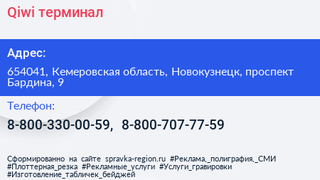 Qiwi, терминал по адресу 654041, Кемеровская область, Новокузнецк, проспект Бардина, 9 в дальнейшем Организация, размещена в следующих категориях:
