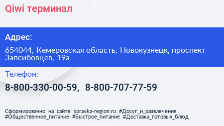 Qiwi, терминал по адресу 654044, Кемеровская область, Новокузнецк, проспект Запсибовцев, 19а в дальнейшем Организация, размещена в следующих категориях: